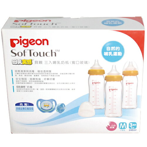 ★衛立兒生活館★貝親 PIGEON 母乳實感寬口玻璃奶瓶 240ml 3入+安撫奶嘴(汽車)特惠組